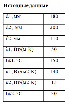 Паропровод диаметром d2/d1 покрыт слоем совелитовой изоляции толщиной δ2, мм. Коэффициенты теплопроводности материала трубы λ1, изоляции λ2= 0,1 Вт/(м·К). Температуры пара tж1 и окружающего воздуха tж2, °С. Требуется определить линейный коэффициент теплопередачи kl, Вт/(м2·K), линейную плотность теплового потока ql, Вт/м и температуру наружной поверхности паропровода t3, °С. Исходные данные приведены в таблице.