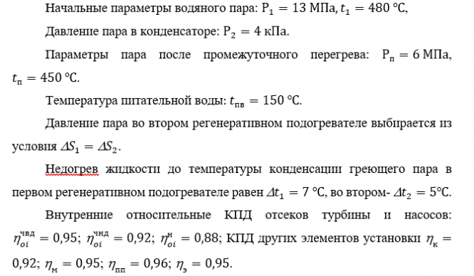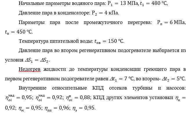 Рассчитать термический и внутренний КПД, удельный расход пара и условного топлива для турбоустановки с промежуточным перегревом пара и двумя регенеративными подогревателями: 1-й - поверхностного, 2-й - поверхностного типов. Определить также среднеинтегральную температуру подвода теплоты в цикле.