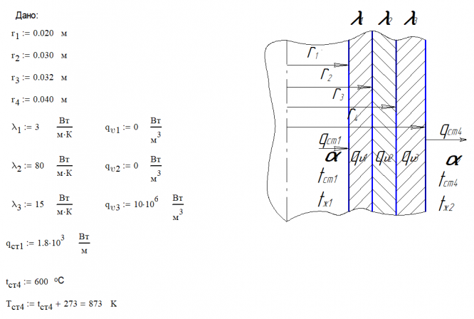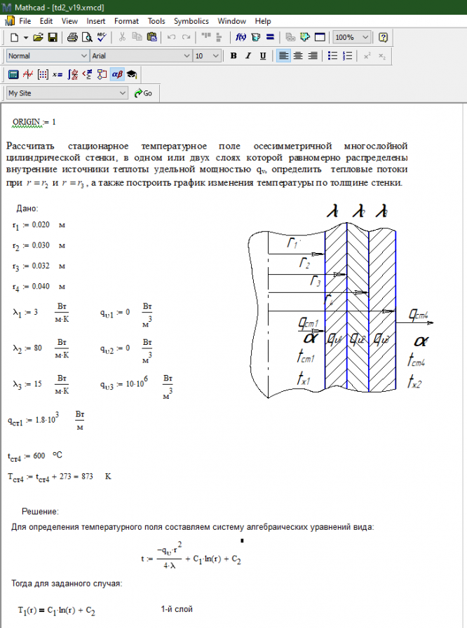 Рассчитать стационарное температурное поле осесимметричной многослойной цилиндрической стенки (Выполнено в MathCAD - универсальное для всех вариантов)