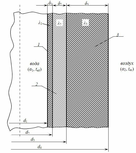 Рисунок 1. Продольный разрез трехслойной трубы: 1 – слой накипи; 2 – металлическая стенка трубы; 3 – слой теплоизоляции