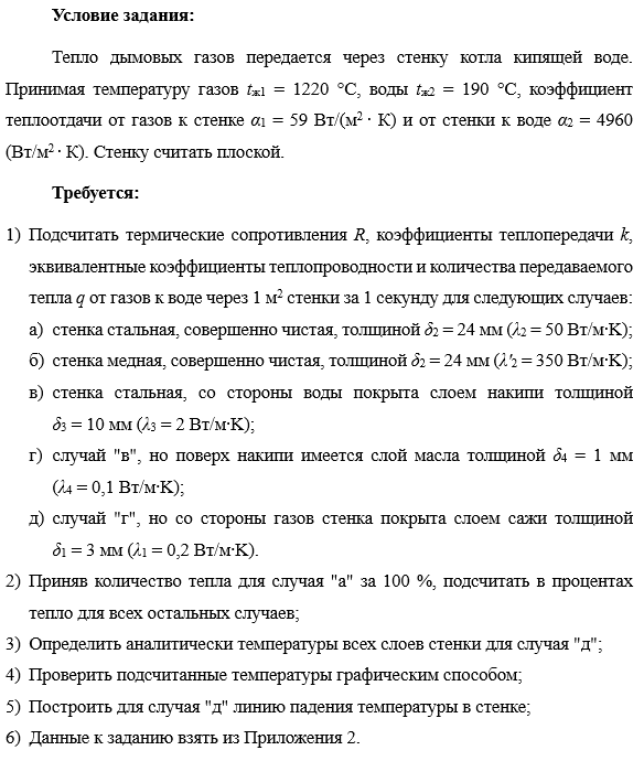 Показать/скрыть дополнительное описание«ТЕПЛОПЕРЕДАЧА» Домашнее задание №2 Теплопередача через многослойную толстую стенку Группа: Вариант: Студент: Преподаватель: Условие задания: Тепло дымовых газов передается через стенку котла кипящей воде. Принимая температуру газов tж1 = 1220 °C, воды tж2 = 190 °C, коэффициент теплоотдачи от газов к стенке α1 = 59 Вт/(м2 ∙ К) и от стенки к воде α2 = 4960 (Вт/м2 ∙ К). Стенку считать плоской. Требуется: Подсчитать термические сопротивления R, коэффициенты теплопередачи k, эквивалентные коэффициенты теплопроводности и количества передаваемого тепла q от газов к воде через 1 м2 стенки за 1 секунду для следующих случаев: стенка стальная, совершенно чистая, толщиной δ2 = 24 мм (λ2 = 50 Вт/м∙K); стенка медная, совершенно чистая, толщиной δ2 = 24 мм (λ'2 = 350 Вт/м∙K); стенка стальная, со стороны воды покрыта слоем накипи толщиной δ3 = 10 мм (λ3 = 2 Вт/м∙K); случай "в", но поверх накипи имеется слой масла толщиной δ4 = 1 мм (λ4 = 0,1 Вт/м∙K); случай "г", но со стороны газов стенка покрыта слоем сажи толщиной δ1 = 3 мм (λ1 = 0,2 Вт/м∙K).