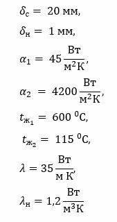 Определить также все указанные выше величины, если стенка со стороны воды покроется слоем накипи толщиной δн; коэффициент теплопроводности накипи .