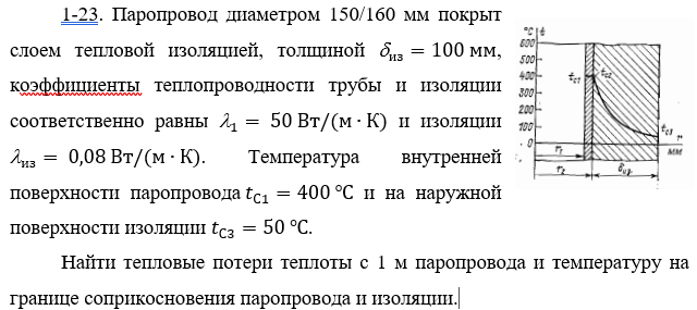 Паропровод диаметром 150/160 мм покрыт слоем тепловой изоляцией, толщиной , коэффициенты теплопроводности трубы и изоляции соответственно равны и изоляции . Температура внутренней поверхности паропровода и на наружной поверхности изоляции .