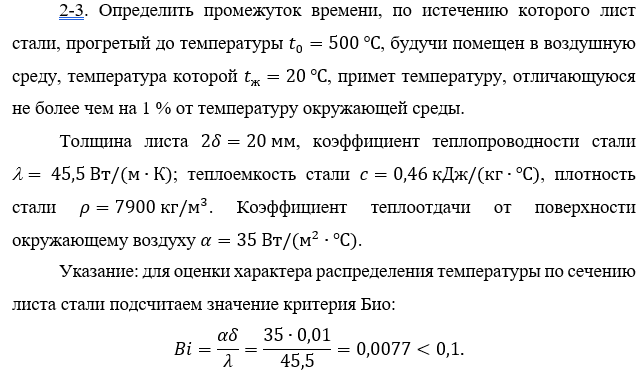2-3. Определить промежуток времени, по истечению которого лист стали, прогретый до температуры , будучи помещен в воздушную среду, температура которой , примет температуру, отличающуюся не более чем на 1 % от температуру окружающей среды.