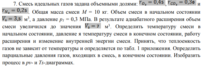 7. Смесь идеальных газов задана объемными долями: , и . Общая масса смеси M = 10 кг. Объем смеси в начальном состоянии м 3 , а давление p1 = 0,3 МПа. В результате адиабатного расширения объем смеси увеличился до значения м 3 . Определить температуру смеси