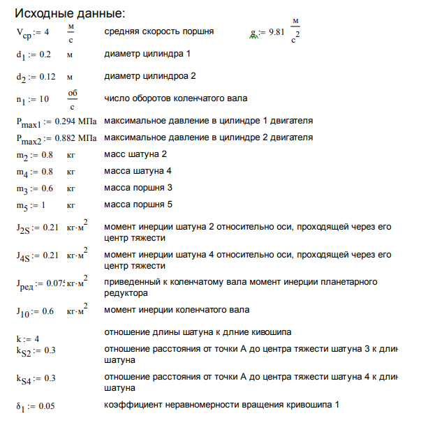 Исходные данные: м/с Vср := 4,2 м/с средняя скорость поршня g := 9,81 м/с2 d1 := 0,2 м диаметр цилиндра 1 d2 := 0,12 м диаметр цилиндра 2 n1 := 10 об/с число оборотов коленчатого вала Pmax1 := 0,294 МПа максимальное давление в цилиндре 1 двигателя Pmax2 := 0,882 МПа максимальное давление в цилиндре 2 двигателя m2 := 0,8 кг масса шатуна 2 m4 := 0,8 кг масса шатуна 4 m3 := 0,6 кг масса поршня 3 m5 := 1 кг масса поршня 5 J2S := 0,21 кг·м2 момент инерции шатуна 2 относительно оси, проходящей через его центр тяжести J4S := 0,21 кг·м2 момент инерции шатуна 4 относительно оси, проходящей через его центр тяжести Jред := 0,075 кг·м2 приведенный к коленчатому валу момент инерции планетарного редуктора J10 := 0,6 кг·м2 момент инерции коленчатого вала отношение длины шатуна к длине кривошипа k := 4 kS2 := 0,3 отношение расстояния от точки А до центра тяжести шатуна 3 к длине шатуна kS4 := 0,3 отношение расстояния от точки А до центра тяжести шатуна 4 к длине шатуна δ1 := 0,05 коэффициент неравномерности вращения кривошипа 1.