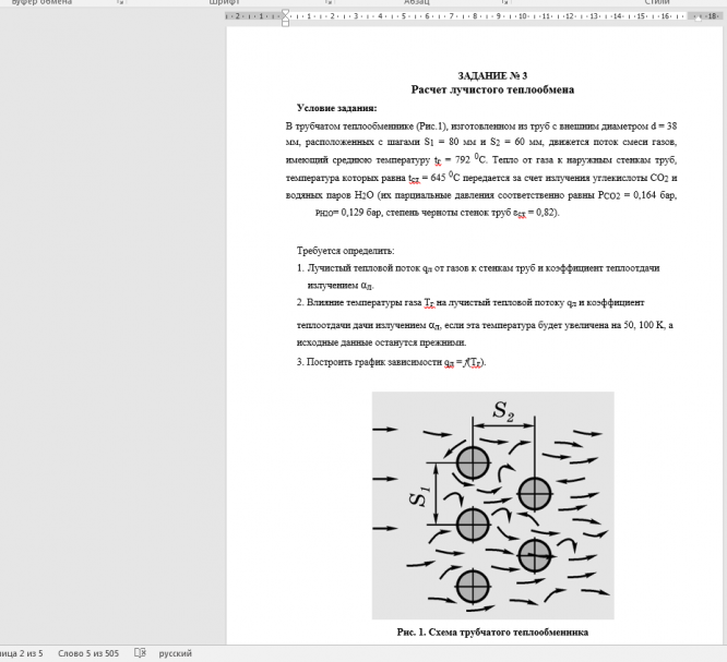 В трубчатом теплообменнике (Рис.1), изготовленном из труб с внешним диаметром d = 38 мм, расположенных с шагами S1 = 80 мм и S2 = 60 мм, движется поток смеси газов, имеющий среднюю температуру tг = 792 0С. Тепло от газа к наружным стенкам труб, температура которых равна tст = 645 0С передается за счет излучения углекислоты CO2 и водяных паров H2O (их парциальные давления соответственно равны PCO2 = 0,164 бар, PH2O= 0,129 бар, степень черноты стенок труб eст = 0,82).