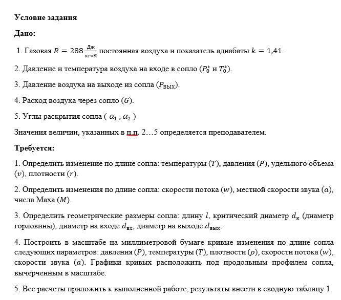 1. Определить изменение по длине сопла: температуры (), давления (), удельного объема (), плотности ().