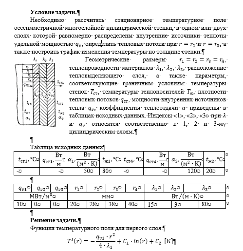 Необходимо рассчитать стационарное температурное поле осесимметричной многослойной цилиндрической стенки, в одном или двух слоях которой равномерно распределены внутренние источники теплоты удельной мощностью , определить тепловые потоки при и , а также построить график изменения температуры по толщине стенки.