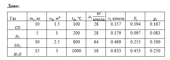 Условия задачи: Сосуд разделен адиабатической перегородкой на четыре части, в каждой из которых содержатся различные газы. После того как перегородка убрана происходит так называемое «смешение в объеме» без теплообмена с окружающей средой. Состояния газов до смешен характеризуются следующими параметрами: массой , кг; объемом ; температурой ; которые приведены в таблице ниже.