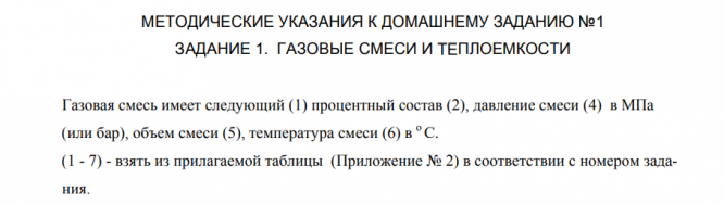 Газовая смесь имеет следующий (1) процентный состав (2), давление смеси (4) в МПа (или бар), объем смеси (5), температура смеси (6) в о C. (1 - 7) - взять из прилагаемой таблицы (Приложение № 2) в соответствии с номером задания.