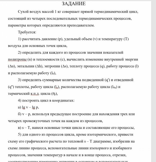 Сухой воздух массой 1 кг совершает прямой термодинамический цикл, состоящий из четырех последовательных термодинамических процессов, параметры которых определяются преподавателем.