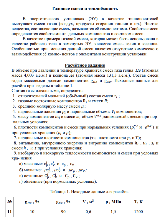 В энергетических установках (ЭУ) в качестве теплоносителей выступают смеси газов (воздух, продукты сгорания топлив и пр.). Чистые вещества, составляющие смесь, называются её компонентами. Свойства смеси определяются свойствами от- дельных компонентов и составом смеси. В качестве примера газовой смеси, которая может быть использована в качестве рабочего тела в замкнутых ЭУ, является смесь гелия и ксенона. Особенностью при- менения данной смеси является отсутствие химического взаимодействия её компо- нентов с элементами конструкции установки. .