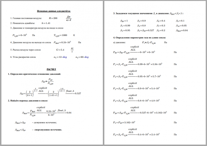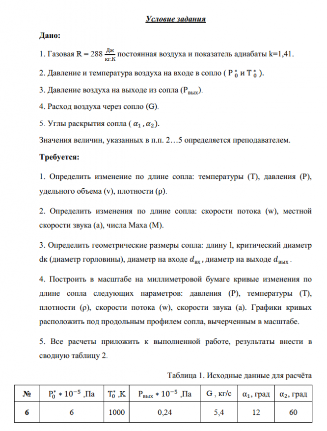 Условие задания Дано: 1. Газовая постоянная воздуха R = 288 Дж/(кг К), показатель адиабаты k = 1,41. 2. Давление и температура воздуха на входе в сопло Р 0* , Т 0* . 3. Давление воздуха на выходе из сопла Р вых . 4. Расход воздуха через сопло G. 5. Углы раскрытия сопла α 1 и α 2 (см. рис. 1). Значения величин, указанных в п. 2...5 взять из Приложения 1 по номеру варианта..