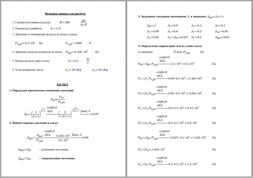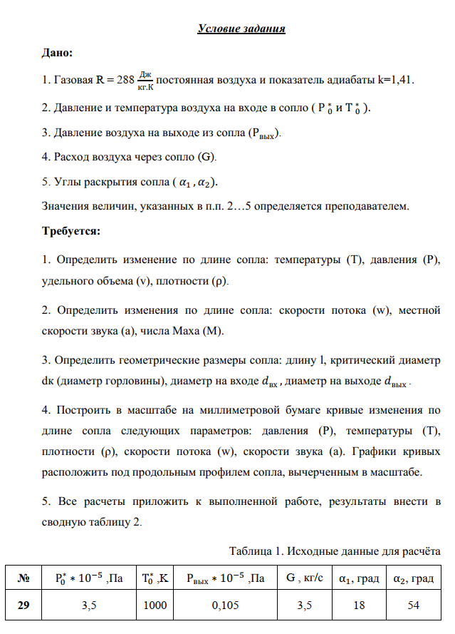 Условие задания Дано: 1. Газовая постоянная воздуха R = 288 Дж/(кг К), показатель адиабаты k = 1,41. 2. Давление и температура воздуха на входе в сопло Р 0* , Т 0* . 3. Давление воздуха на выходе из сопла Р вых . 4. Расход воздуха через сопло G. 5. Углы раскрытия сопла α 1 и α 2 (см. рис. 1). Значения величин, указанных в п. 2...5 взять из Приложения 1 по номеру варианта..