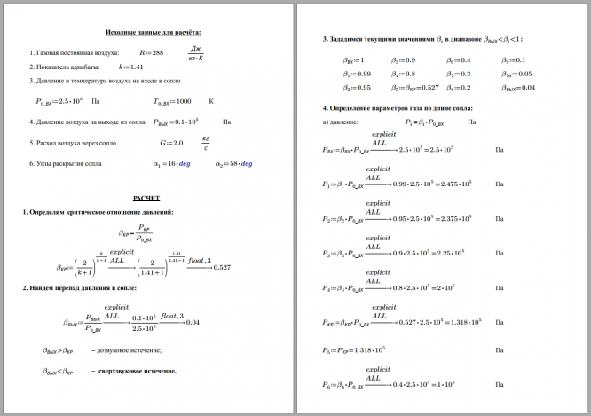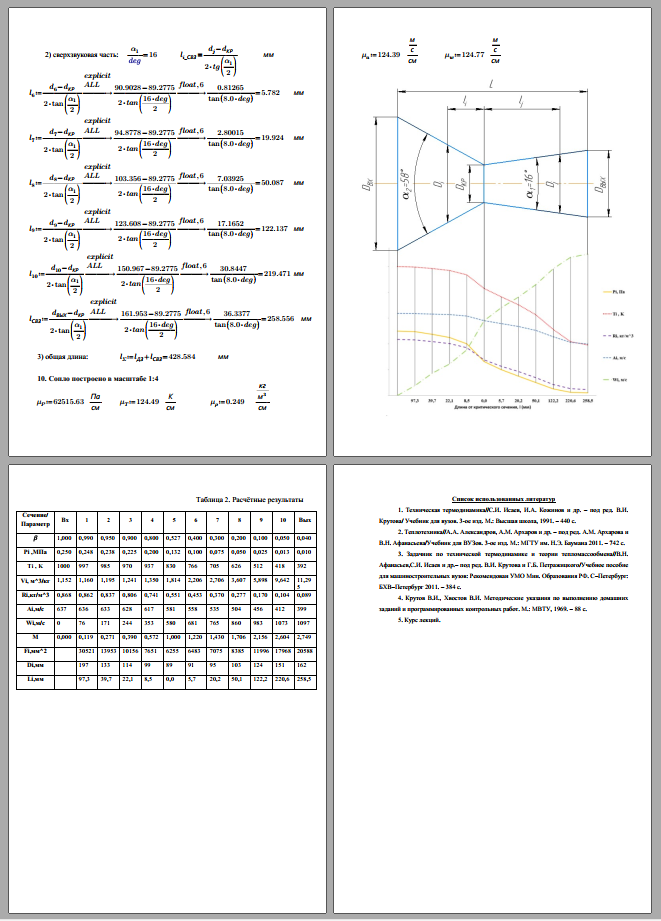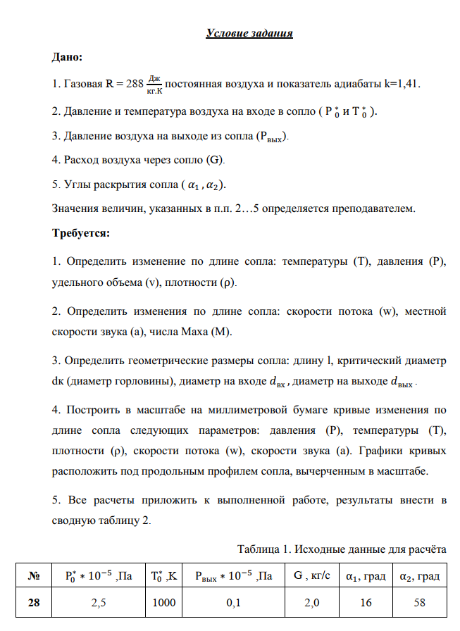 Условие задания Дано: 1. Газовая постоянная воздуха R = 288 Дж/(кг К), показатель адиабаты k = 1,41. 2. Давление и температура воздуха на входе в сопло Р 0* , Т 0* . 3. Давление воздуха на выходе из сопла Р вых . 4. Расход воздуха через сопло G. 5. Углы раскрытия сопла α 1 и α 2 (см. рис. 1). Значения величин, указанных в п. 2...5 взять из Приложения 1 по номеру варианта..