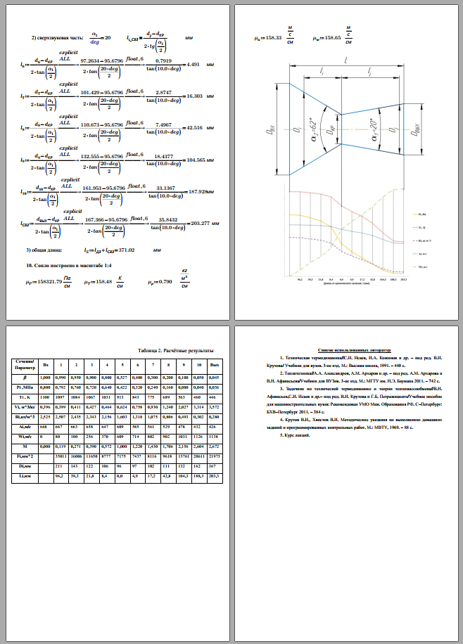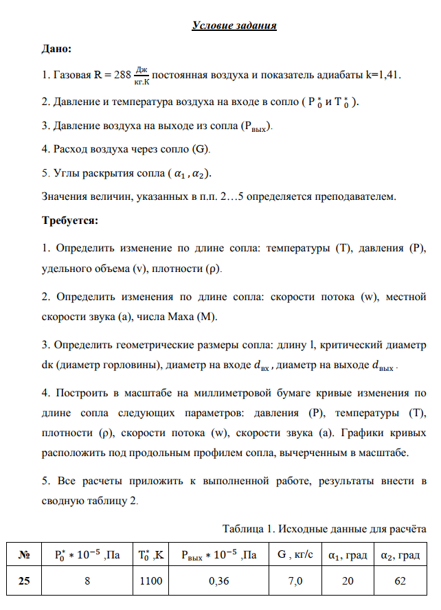 Условие задания Дано: 1. Газовая постоянная воздуха R = 288 Дж/(кг К), показатель адиабаты k = 1,41. 2. Давление и температура воздуха на входе в сопло Р 0* , Т 0* . 3. Давление воздуха на выходе из сопла Р вых . 4. Расход воздуха через сопло G. 5. Углы раскрытия сопла α 1 и α 2 (см. рис. 1). Значения величин, указанных в п. 2...5 взять из Приложения 1 по номеру варианта..