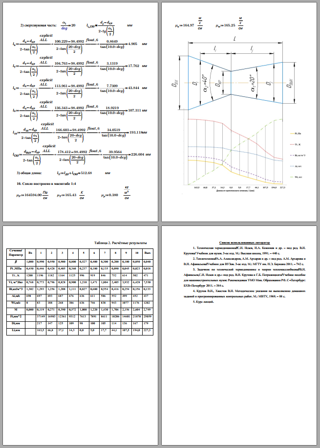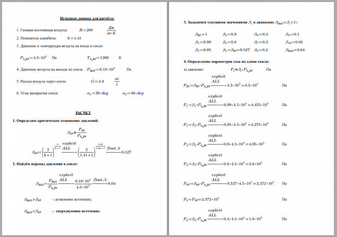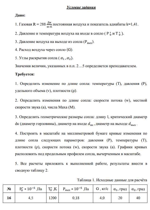 Условие задания Дано: 1. Газовая постоянная воздуха R = 288 Дж/(кг К), показатель адиабаты k = 1,41. 2. Давление и температура воздуха на входе в сопло Р 0* , Т 0* . 3. Давление воздуха на выходе из сопла Р вых . 4. Расход воздуха через сопло G. 5. Углы раскрытия сопла α 1 и α 2 (см. рис. 1). Значения величин, указанных в п. 2...5 взять из Приложения 1 по номеру варианта..