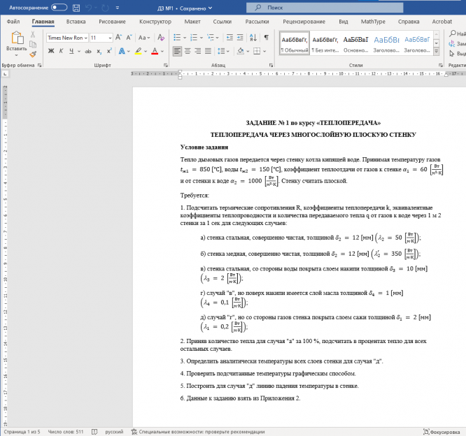 ЗАДАНИЕ № 1 по курсу «ТЕПЛОПЕРЕДАЧА»