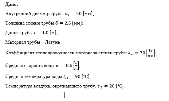 Тепло горячей воды, движущейся внутри круглой горизонтальной трубы, передаётся воздуху, омывающему трубу по наружной поверхности свободным потоком.