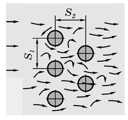 Условие задачи:  В трубчатом теплообменнике (Рис. 1), изготовленном из труб с внешним диаметром , распложенных с шагами  и , движется поток смеси газов, имеющий среднюю температуру . Тепло от газа к наружным стенкам труб, температура которых равна , передается за счет излучения углекислоты  и водяных паров  (их парциальные давления соответственно равны , , степень черноты труб ).   Требуется определить: Лучистый тепловой поток  от газов к стенкам труб и коэффициент теплоотдачи излучением . Влияние температуры газа  на лучисты тепловой поток  и коэффициент теплоотдачи излучением , если эта температура будет увеличена на , а исходные данные останутся прежними.