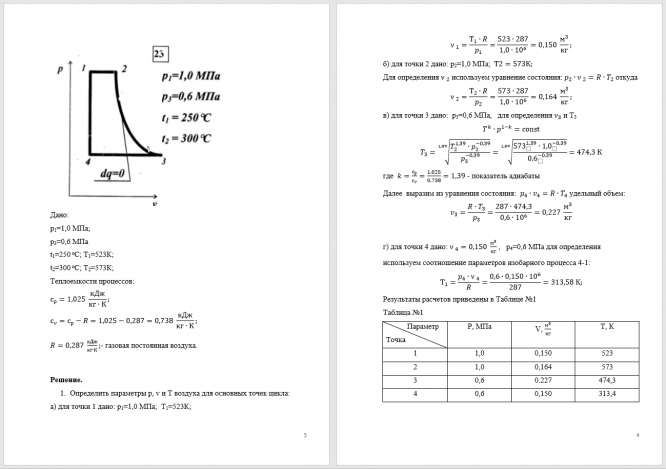 1) рассчитать давление (p), удельный объем (v) и температуру (T) воздуха для основных точек цикла,