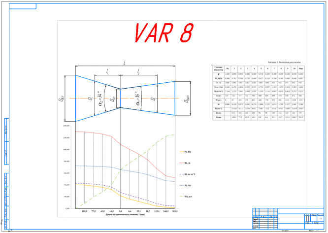 4. Построить в масштабе на миллиметровой бумаге кривые изменения по длины сопла: давления p, температуры Т, плотности ρ, скорости потока w, скорости звука а. Графики кривых расположить под продольным профилем сопла, вычерченным в масштабе. Все расчеты приложить к выполненной работе. Результаты внести в сводную таблицу (см. табл. 2). .