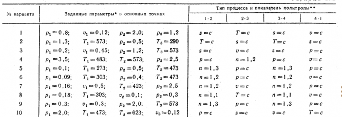Сухой воздух массой 1 кг совершает прямой термодинамический цикл, состоящий из четырех последовательных термодинамических процессов. Данные, необходимые для расчета в зависимости от варианта, приведены в табл. 21.2.