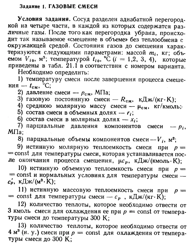 Сосуд разделен адиабатной перегородкой на четыре части, в каждой из которых содержатся различные газы. После того, как перегородка убрана, происходит так называемое смешение в объеме без теплообмена с окружающей средой.