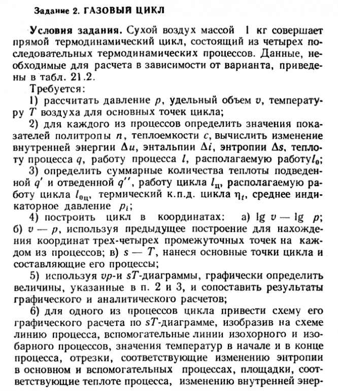 Сухой воздух массой 1 кг совершает прямой термодинамический цикл, состоящий из четырех последовательных термодинамических процессов. Данные, необходимые для расчета в зависимости от варианта, приведены в табл. 21.2.