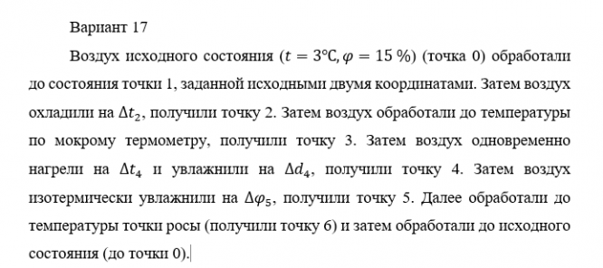 Воздух исходного состояния ( ) (точка 0) обработали до состояния точки 1, заданной исходными двумя координатами. Затем воздух охладили на , получили точку 2. Затем воздух обработали до температуры по мокрому термометру, получили точку 3. Затем воздух одновременно нагрели на и увлажнили на , получили точку 4. Затем воздух изотермически увлажнили на , получили точку 5. Далее обработали до температуры точки росы (получили точку 6) и затем обработали до исходного состояния (до точки 0).