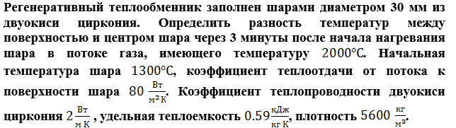 Регенеративный теплообменник заполнен шарами диаметром 30 мм из двуокиси циркония. Определить разность температур между поверхностью и центром шара через 3 минуты после начала нагревания шара в потоке газа, имеющего температуру . Начальная температура шара , коэффициент теплоотдачи от потока к поверхности шара . Коэффициент теплопроводности двуокиси циркония , удельная теплоемкость , плотность .