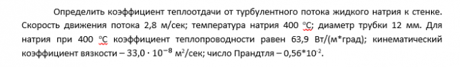 Определить коэффициент теплоотдачи от турбулентного потока жидкого натрия к стенке. Скорость движения потока 2,8 м/сек; температура натрия 400 оС; диаметр трубки 12 мм. Для натрия при 400 оС коэффициент теплопроводности равен 63,9 Вт/(м*град); кинематический коэффициент вязкости – м2/сек; число Прандтля – 0,56*10-2.