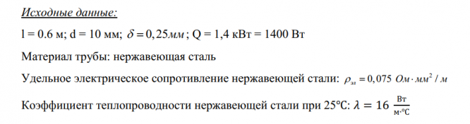 Из нержавеющей стали сделана труба длиной 0,6 м и диаметром 10х0,25 мм. Она включена в электрическую цепь. Вычислить силу тока, пропускаемого по трубе, и перепад температур по толщине, если от внешней поверхности трубы отводится тепловой поток 1,4кВт