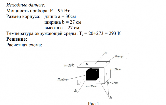 Задача 2: Электронный прибор потребляет при работе 95 Вт мощности и помещен в корпус из тонколистовой стали размерами 27х27х30см. Определить температуру поверхности корпуса, если он покоится на теплоизолированной поверхности. Температура окружающей среды 20⁰С, потерями излучением можно пренебречь. Высота корпуса 27см.