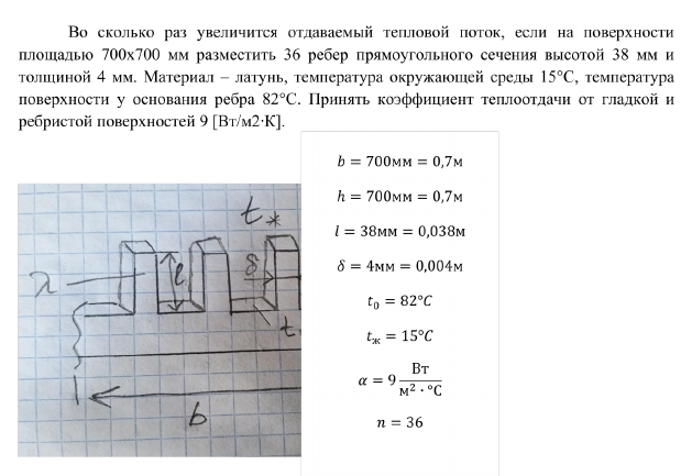 Во сколько раз увеличится отдаваемый тепловой поток, если на поверхности площадью 700х700 мм разместить 36 ребер прямоугольного сечения высотой 38 мм и толщиной 4 мм. Материал – латунь, температура окружающей среды 15°С, температура поверхности у основания ребра 82°С. Принять коэффициент теплоотдачи от гладкой и ребристой поверхностей 9 [Вт/м2∙К].