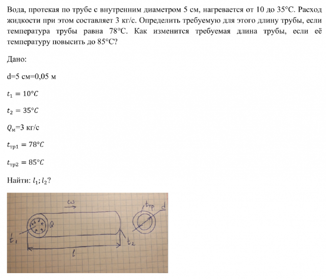 Вода, протекая по трубе с внутренним диаметром 5 см, нагревается от 10 до 35°С. Расход жидкости при этом составляет 3 кг/с. Определить требуемую для этого длину трубы, если температура трубы равна 78°С. Как изменится требуемая длина трубы, если её температуру повысить до 85°С?