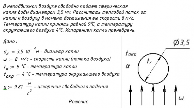 В неподвижном воздухе свободно падает сферическая капля воды диаметром 3,5 мм. Рассчитать тепловой поток от капли к воздуху в момент достижения ею скорости 8 м/с. Температуру капли принять равной 9⁰С, а температуру окружающего воздуха 4⁰С. Испарением капли пренебречь.