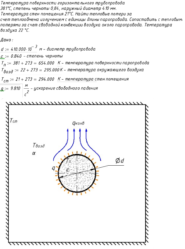 Температура поверхности горизонтального трубопровода 381°С, степень черноты 0,84, наружныи диаметр 410 мм. Температура стен помещения 21°С. Наити тепловые потери за счет теплообмена излучением с единицы длины паропровода. Сопоставить с тепловыми потерями за счет свободной конвекции воздуха около паропровода. Температура воздуха 22 °С.