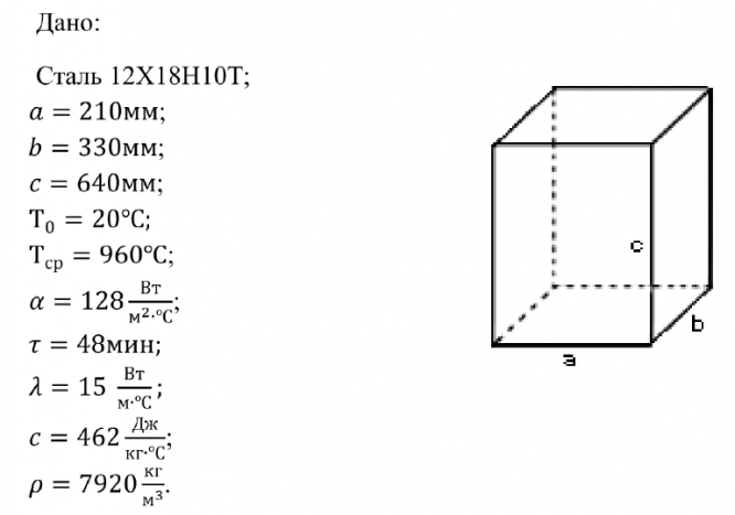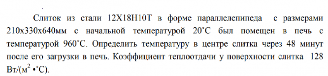 Слиток из стали 12Х18Н10Т в форме параллелепипеда с размерами 210х330х640мм с начальной температурой 20˚С был помещен в печь с температурой 960˚С. Определить температуру в центре слитка через 48 минут после его загрузки в печь. Коэффициент теплоотдачи у поверхности слитка 128 Вт/(м2 •˚С).