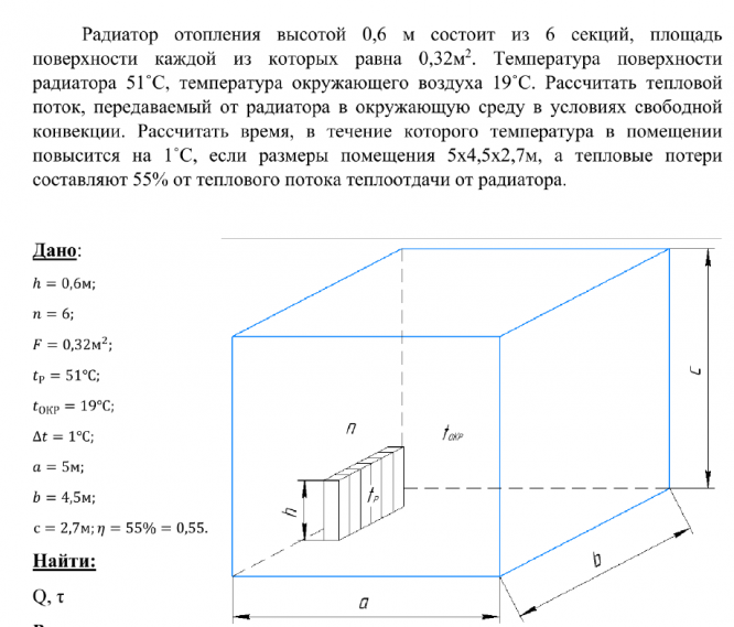 Радиатор отопления высотой 0,6 м состоит из 6 секций, площадь поверхности каждой из которых равна 0,32м2. Температура поверхности радиатора 51˚С, температура окружающего воздуха 19˚С. Рассчитать тепловой поток, передаваемый от радиатора в окружающую среду в условиях свободной конвекции. Рассчитать время, в течение которого температура в помещении повысится на 1˚С, если размеры помещения 5х4,5х2,7м, а тепловые потери составляют 55% от теплового потока теплоотдачи от радиатора.