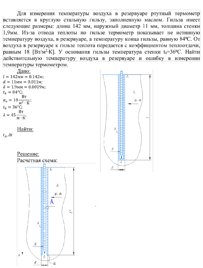 Для измерения температуры воздуха в резервуаре ртутный термометр вставляется в круглую стальную гильзу, заполненную маслом. Гильза имеет следующие размеры: длина 142 мм, наружный диаметр 11 мм, толщина стенки 1,9мм. Из-за отвода теплоты по гильзе термометр показывает не истинную температуру воздуха, в резервуаре, а температуру конца гильзы, равную 84⁰С. От воздуха в резервуаре к гильзе теплота передается с коэффициентом теплоотдачи, равным 18 [Вт/м2∙К]. У основания гильзы температура стенки t0=36⁰С. Найти действительную температуру воздуха в резервуаре и ошибку в измерении температуры термометром.