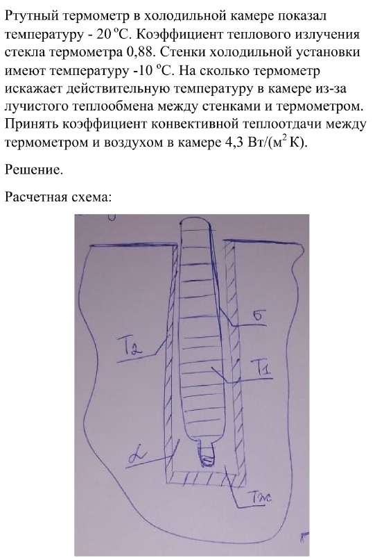 Ртутный термометр в холодильной камере показал температуру - 20 оС. Коэффициент теплового излучения стекла термометра 0,88. Стенки холодильной установки имеют температуру -10 оС. На сколько термометр искажает действительную температуру в камере из-за лучистого теплообмена между стенками и термометром. Принять коэффициент конвективной теплоотдачи между термометром и воздухом в камере 4,3 Вт/(м2 К).