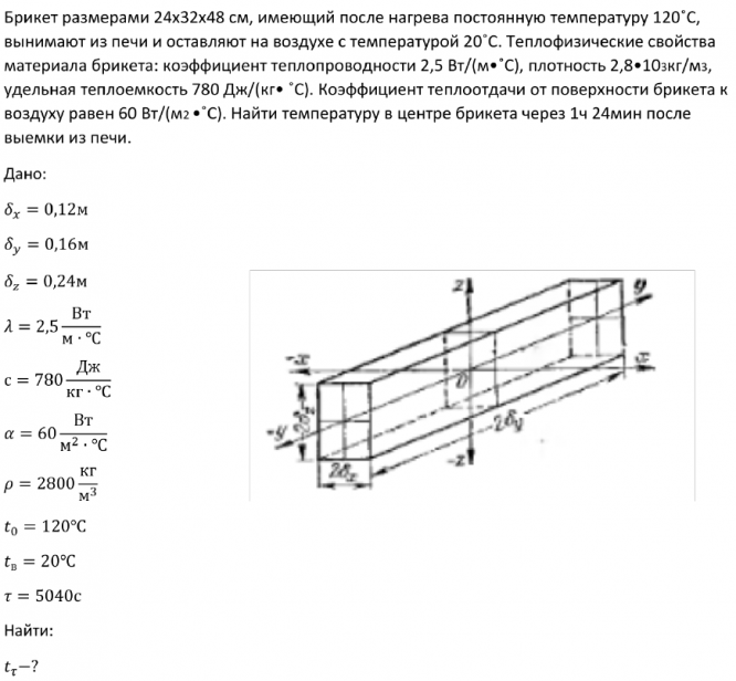 Брикет размерами 24х32х48 см, имеющий после нагрева постоянную температуру 120˚С, вынимают из печи и оставляют на воздухе с температурой 20˚С. Теплофизические свойства материала брикета: коэффициент теплопроводности 2,5 Вт/(м•˚С), плотность 2,8•103кг/м3, удельная теплоемкость 780 Дж/(кг• ˚С). Коэффициент теплоотдачи от поверхности брикета к воздуху равен 60 Вт/(м2 •˚С). Найти температуру в центре брикета через 1ч 24мин после выемки из печи.