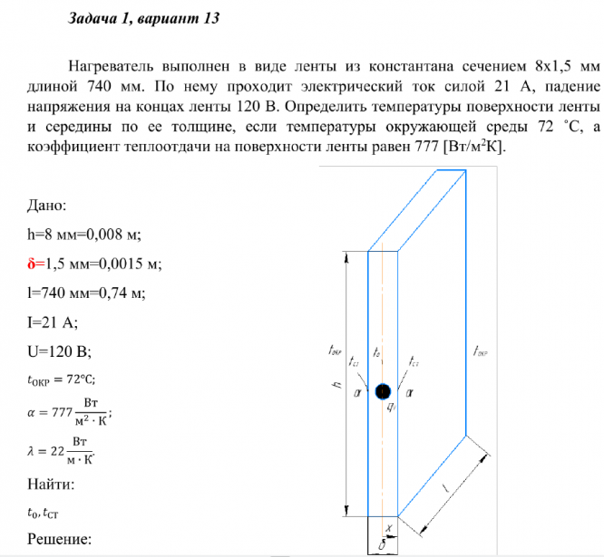 Нагреватель выполнен в виде ленты из константана сечением 8х1,5 мм длиной 740 мм. По нему проходит электрический ток силой 21 А, падение напряжения на концах ленты 120 В. Определить температуры поверхности ленты и середины по ее толщине, если температуры окружающей среды 72 ˚С, а коэффициент теплоотдачи на поверхности ленты равен 777 [Вт/м2К].