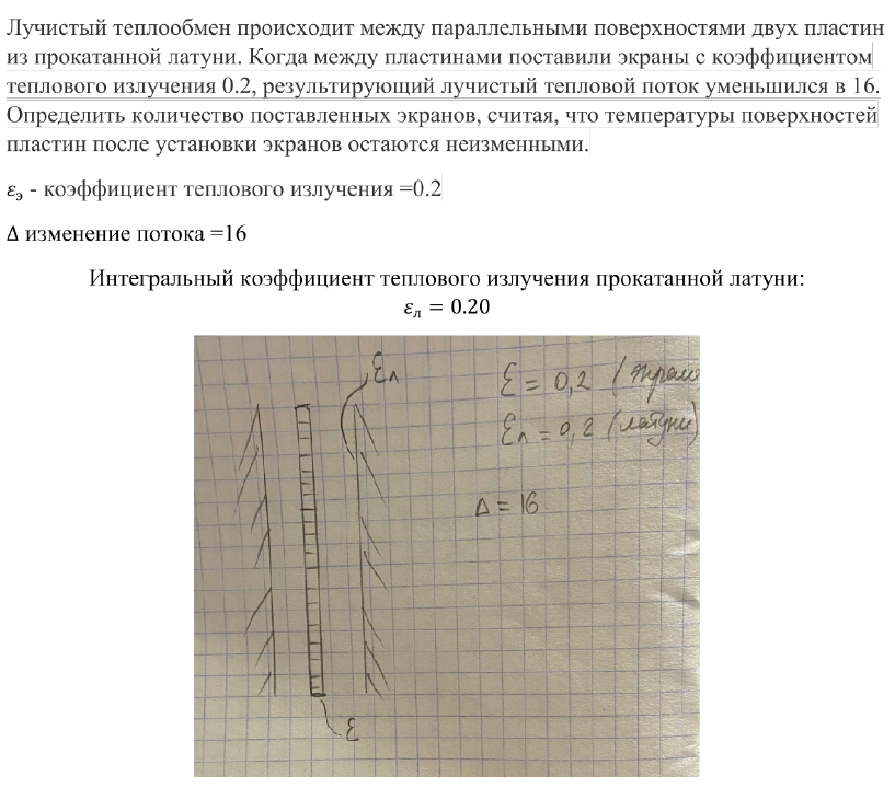 Лучистый теплообмен происходит между параллельными поверхностями двух пластин из прокатанной латуни. Когда между пластинами поставили экраны с коэффициентом теплового излучения 0.2, результирующий лучистый тепловой поток уменьшился в 16. Определить количество поставленных экранов, считая, что температуры поверхностей пластин после установки экранов остаются неизменными.