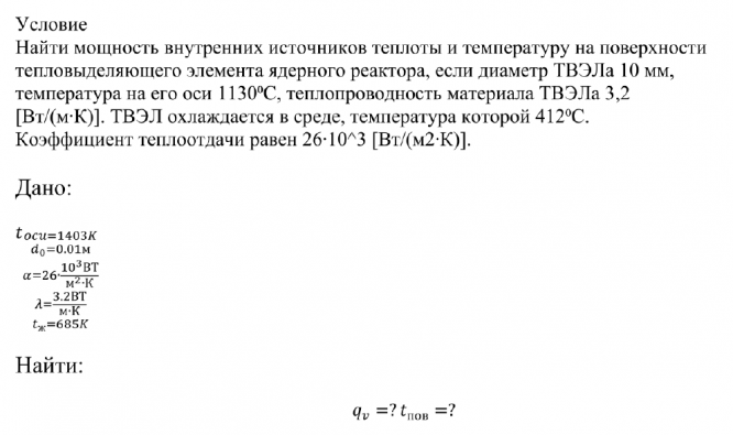Найти мощность внутренних источников теплоты и температуру на поверхности тепловыделяющего элемента ядерного реактора, если диаметр ТВЭЛа 10 мм, температура на его оси 1130⁰С, теплопроводность материала ТВЭЛа 3,2 [Вт/(м∙К)]. ТВЭЛ охлаждается в среде, температура которой 412⁰С. Коэффициент теплоотдачи равен 26∙10^3 [Вт/(м2∙К)].