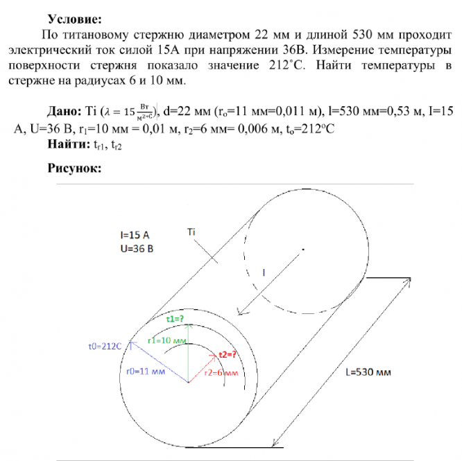 По титановому стержню диаметром 22 мм и длиной 530 мм проходит электрический ток силой 15А при напряжении 36В. Измерение температуры поверхности стержня показало значение 212˚С. Найти температуры в стержне на радиусах 6 и 10 мм.