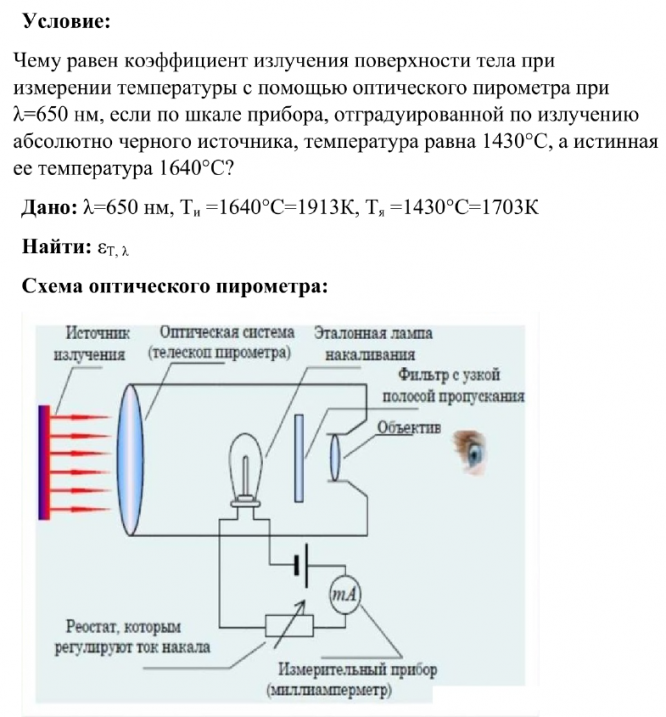Чему равен коэффициент излучения поверхности тела при измерении температуры с помощью оптического пирометра при λ=650 нм, если по шкале прибора, отградуированной по излучению абсолютно черного источника, температура равна 1430°C, а истинная ее температура 1640°C?