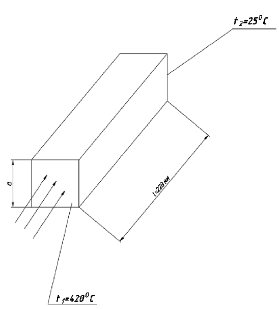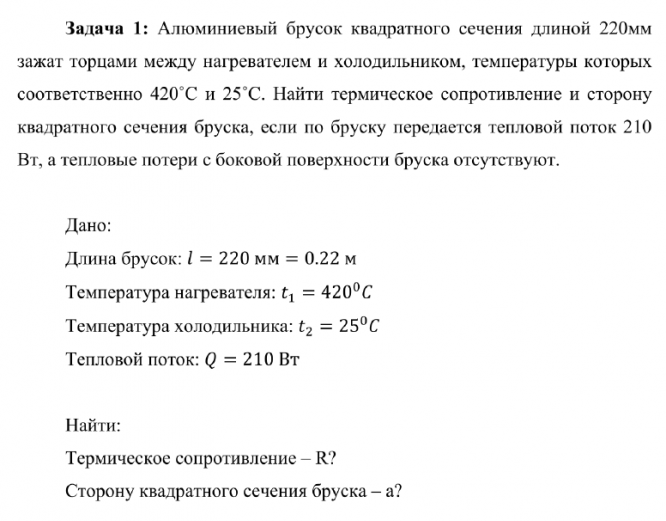 Алюминиевый брусок квадратного сечения длиной 220мм зажат торцами между нагревателем и холодильником, температуры которых соответственно 420˚С и 25˚С. Найти термическое сопротивление и сторону квадратного сечения бруска, если по бруску передается тепловой поток 210 Вт, а тепловые потери с боковой поверхности бруска отсутствуют.